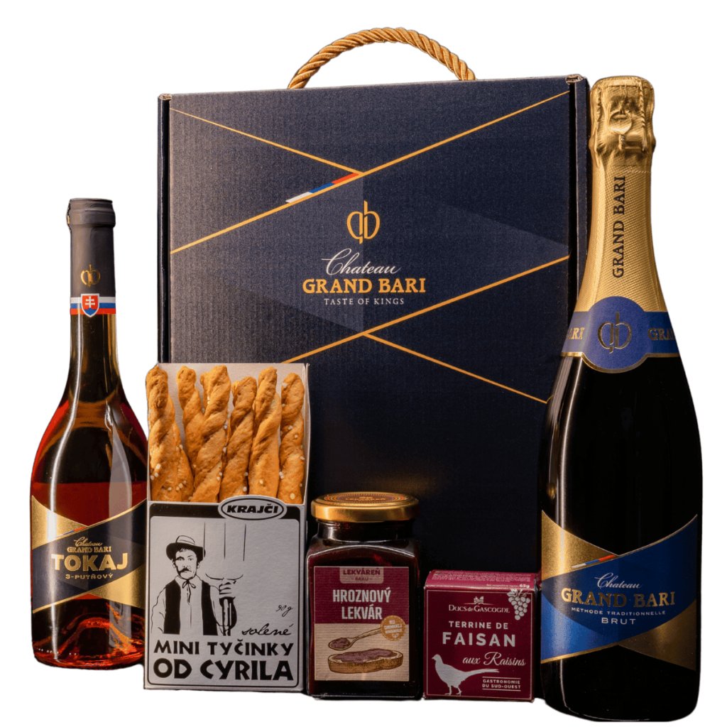 O výrobku: | Tento darčekový set bol vytvorený pre pohladenie Vašich chuťových pohárikov. Plné bublinky v kvalitnom sekte sme párovali s vysoko kvalitnou talianskou paštétou, ktorú si viete krásne dochutiť so slovenským hroznovým lekvárom. Balenie obsahuje slané tyčinky na štýl grissin, ktoré úžasne dopĺňajú spojenie pochutín a vína. A samozrejme aby sme nezabudli na sladkú bodku, Tokajský výber 3-putňový, ktorý uzatvára tento senzorický pôžitok. |